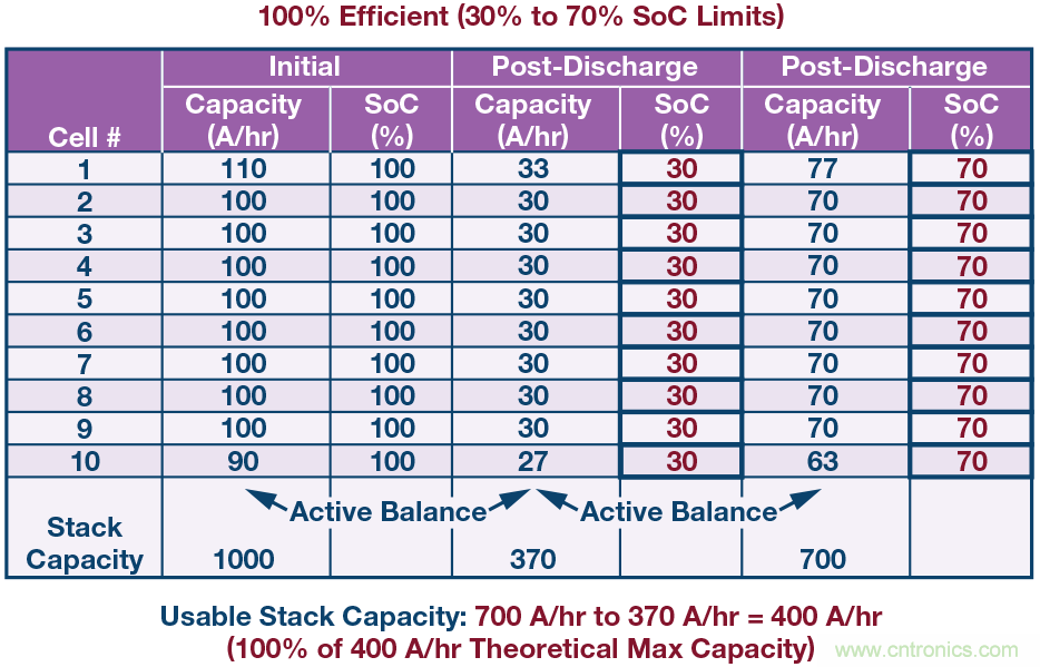 電池單元間的容量或SoC不匹配可能會嚴重降低電池包可用容量,除非均衡電池單元。為使電池包容量最大化,要求在電池包充電和放電期間,電池單元是均衡的。在圖2所示的例子中,一個10單元串聯(lián)電池包由(標(biāo)稱)100 安時電池單元組成,最小容量單元與最大容量單元的容量誤差為±10%,對該電池包充電和放電,直至達到預(yù)定SoC限值。如果SoC值限制在30%和70%之間,并且不進行均衡,則經(jīng)過一次完全充電/放電循環(huán)之后,電池包可用容量相對于理論可用容量減少25%。被動均衡理論上可以在電池包充電階段均衡各電池單元的SoC,但在放電期間,無法阻止第10個單元先于其他單元達到30%的SoC水平。即使在電池包充電期間進行被動均衡,在電池包放電期間也會損失可觀的容量(不可用)。只有主動均衡解決方案才能恢復(fù)容量,在電池包放電期間將電荷從高SoC單元重新分配給低SoC單元。