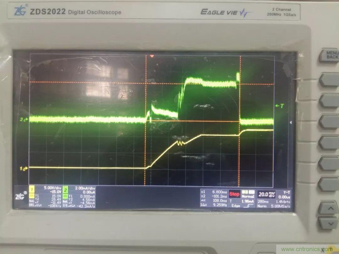 如下圖3所示,為圖2電路的實(shí)驗(yàn)波形圖,綠色為IE電流波形,黃色為VDD電壓波形(示波器采用zlgZDS2022)。從圖中可看出開(kāi)關(guān)電源啟動(dòng)可分三個(gè)階段,第一階段,在上電時(shí)IE以近似1mA的電流向電容C充電,當(dāng)VDD電壓達(dá)到UCC28C40門限電壓時(shí)進(jìn)入第二階段,此時(shí)飽和電流增加至5mA,在為IC供電的同時(shí)繼續(xù)為電容充電,當(dāng)輸出電壓建立后進(jìn)入第三階段,此時(shí)IE電流為零,啟動(dòng)電路停止工作,VDD電壓上升至輔助繞組電壓。在啟動(dòng)的整個(gè)過(guò)程中,IE的電流都是比較小而且比較平緩,所以該電路安全可靠。