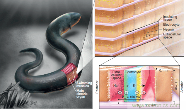 電鰻是一種淡水魚類,能通過特化的肌肉組織放電。它們的體長可達(dá)兩米,而放電器官的長度就可達(dá)體長的80%。在放電器官中有數(shù)以千計的特化肌肉細(xì)胞,稱為“放電體”(electrocyte)。每個放電體只能產(chǎn)生很小的電壓,但數(shù)千個放電體合在一起,就能產(chǎn)生高達(dá)600伏的電壓,足以擊倒一個人,甚至一匹馬。電鰻的放電機制為伏打提供了發(fā)明電池的靈感,使他稱為一位19世紀(jì)的名人。