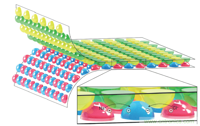 紅色凝膠含有鹽水,而藍(lán)色凝膠含有淡水。離子原本會從紅色凝膠流向藍(lán)色凝膠,但由于基板的間隔,無法出現(xiàn)這樣的流動。與此同時,與這塊基板對應(yīng)的另一塊基板上布置了綠色和黃色凝膠,當(dāng)它們橋接在藍(lán)色和紅色凝膠之間的空隙時,就能為離子運動提供通道。