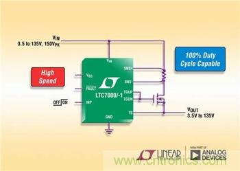 LTC7000是一款快速、高壓側(cè) N 溝道 MOSFET 柵極驅(qū)動器,主要接收一個參考于地的低電壓數(shù)字輸入信號,并以 35ns 的傳播延遲完全接通或關(guān)斷一個其漏極可高出地電位達 135V 的高壓側(cè) N 溝道 MOSFET。13ns的快速上升和下降時間 (當驅(qū)動一個 1000pF 負載) 最大限度降低了