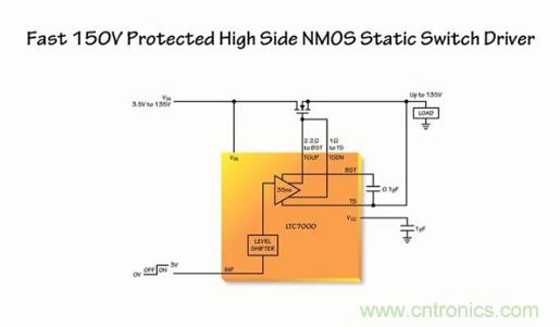 LTC7000 在 INP 引腳上接收一個參考于地的低電壓數(shù)字信號、把該信號電平移位至高達 VIN 電壓。并控制片內(nèi)低阻抗上拉和下拉器件,能快速接通或判斷一個其漏極可高出地電位達 135V 的高壓側(cè) N 溝道 MOSFET。從低電壓 INP 信號至得到全面強化或被完全關(guān)斷的 N 溝道 MOSFET 之傳播延遲約為 35ns,這也促成了許多應(yīng)用。