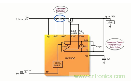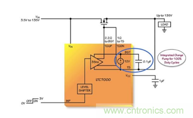 開關(guān)損耗。其內(nèi)部充電泵全面強化一個外部 N 溝道 MOSFET 開關(guān),因而使之能無限期地保持導(dǎo)通。
