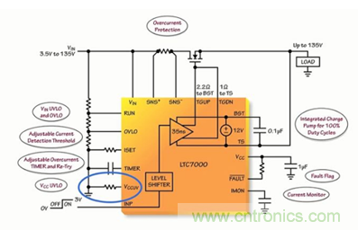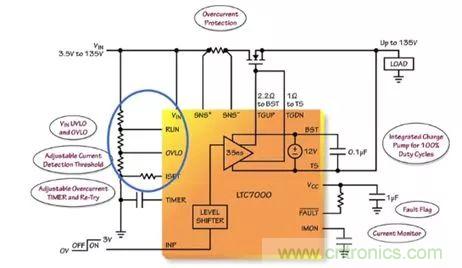 LTC7000 能夠避免負載遭受 VIN 引腳上的過壓和欠壓情況的損壞。“一個連接在 VIN 和地之間、且抽頭連接至 RUN 和 OVLO 引腳的簡單電阻分壓器將設(shè)定一個針對負載的有效操作窗口。當 VIN 位于由 RUN 和 OVLO 引腳所設(shè)定的操作窗口之外時,則關(guān)斷外部 MOSFET,并保護負載免遭潛在損壞或發(fā)生故障。” Mark Mullen這樣談到。