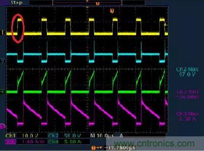 不管是在CCM模式還是DCM模式,在mosfet關斷off時刻,變壓器副邊電流IS波形都有一些震蕩。主要原因是次級電感+肖特基接電容+輸出電容之間的諧振造成的。