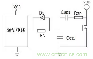 功率MOSFET的跨導大,開通過程中,VGS較小的變化都會導致ID急劇的變化,進而導致VDS急劇的變化,瞬態(tài)過程中柵極電壓容易產生振蕩。串聯電阻RGD可以抑制回路的瞬態(tài)高頻電流,形成阻尼振蕩從而抑止柵極的高頻振蕩,減小振蕩的幅度。