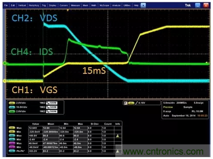 根據系統(tǒng)浪涌電流和di/dt的要求,使用上面公式就可以求出外加的電容CGS1,由此選取相應的標準電容值。不同的CGS1值可以改變過沖的峰值浪涌電流的大小。