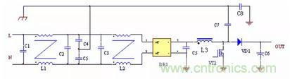 解決傳導(dǎo)騷擾目前大都采用無源濾波器,如上圖 1 中所示,C1、C2、C3、C4、C5、L1、L2 組成一個EMI 濾波器,L1、L2 是兩個共模電感,一般來說,在共模電感當(dāng)中,含有20%左右的差模電感,與電容C1、C2、C3 構(gòu)成差模濾波器,C4、C5 是共模電容,與電感L1、L2 構(gòu)成共模濾波器。