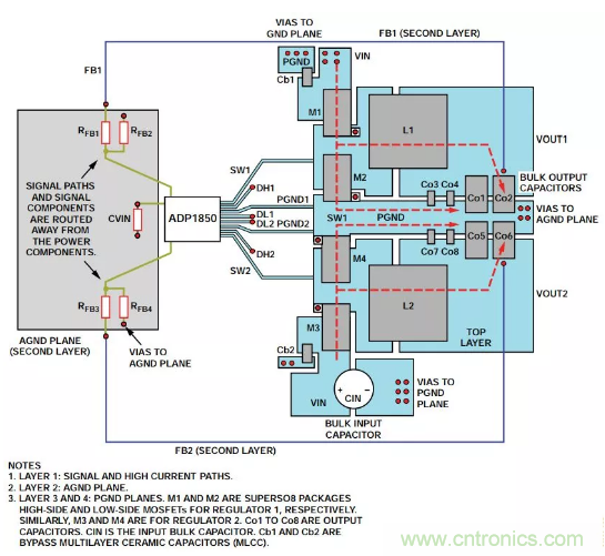 圖2所示為采用開關(guān)控制器ADP1850的雙路輸出降壓轉(zhuǎn)換器的PCB布局。請注意,電源器件的布局將電流環(huán)路面積和寄生電感降至最小。虛線表示高電流路徑。同步和異步控制器均可以使用這一物理規(guī)劃技術(shù)。在異步控制器設(shè)計中,肖特基二極管取代低端開關(guān)。