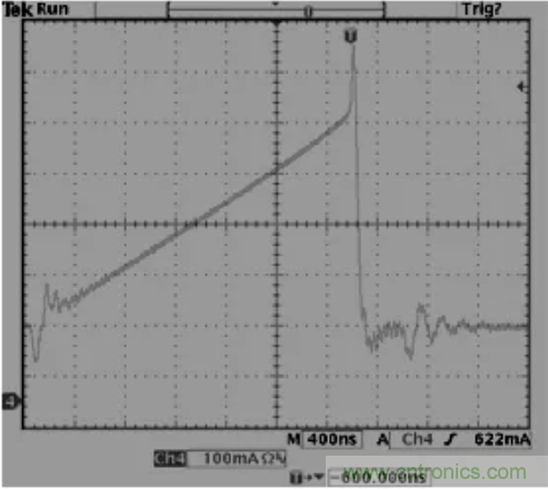 32.反激拓補(bǔ)結(jié)構(gòu),變壓器B值需小于3500高斯,如果變壓器飽和一切動(dòng)作將會(huì)失控,如下,上圖為正常,下圖為飽和。