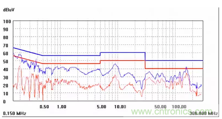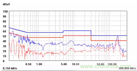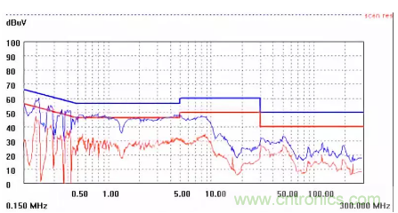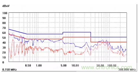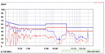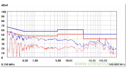 圖一a可以看出,改變PCB布局后130M-200M已經(jīng)完全被衰減,但是30-130M沒(méi)有圖一效果好,可能變壓器出線無(wú)交叉好一些。仔細(xì)觀察,此IC具有抖頻功能,傳導(dǎo)部分頻段削掉了一些尖峰;