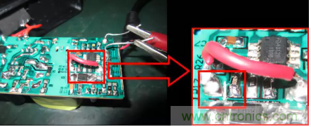 通過(guò)斷開(kāi)PCB銅箔使用一根導(dǎo)線連到輸出電容地,隔開(kāi)ME4312B芯片地,如下圖: