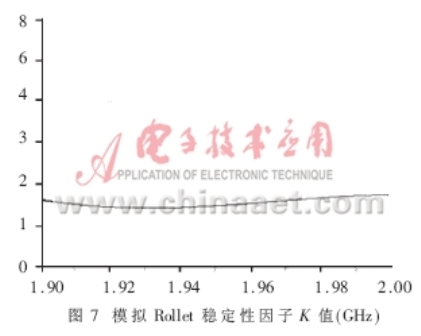 除了能夠得出增益、NF、P1dB和輸入輸出回波等重要參數(shù)外,軟件模擬還能夠得出關(guān)于電路設(shè)計穩(wěn)定性的信息。它是電路能否正常工作的重要前提。模擬軟件計算Rollet穩(wěn)定性因子K和作穩(wěn)定性圓是兩種很容易做到的方法,它們可以明確地表示出穩(wěn)定性的數(shù)據(jù)。圖7示出的Rollett穩(wěn)定因子K的模擬值(K>1)表明:在1.9~2.0GHz工作帶寬范圍,電路能夠?qū)崿F(xiàn)無條件穩(wěn)定。
