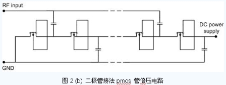 無(wú)源RFID 標(biāo)簽芯片工作時(shí)所需要的能量完全來(lái)源于讀卡器產(chǎn)生的電磁波的能量,因此,電源恢復(fù)電路需要將標(biāo)簽天線感應(yīng)出的超高頻信號(hào)轉(zhuǎn)換為芯片工作需要的直流電壓,為芯片提供能量。本文第2 部分將介紹電源恢復(fù)電路的設(shè)計(jì)。由于RFID 標(biāo)簽所處的電磁環(huán)境是十分復(fù)雜的,輸入信號(hào)的功率可以變化幾百甚至幾千倍,因此,為了芯片在大小不同的場(chǎng)強(qiáng)中均可以正常工作,必須設(shè)計(jì)可靠的電源穩(wěn)壓電路。本文第3部分將對(duì)電源穩(wěn)壓電路的設(shè)計(jì)進(jìn)行說(shuō)明。調(diào)制與解調(diào)電路是標(biāo)簽與讀卡器進(jìn)行通信的關(guān)鍵電路,目前絕大部分的UHF RFID 標(biāo)簽采用的是ASK調(diào)制,本文在第4 部分對(duì)調(diào)制與解調(diào)進(jìn)行介紹。RFID 標(biāo)簽的控制單元是處理指令的數(shù)字電路。為使標(biāo)簽在進(jìn)入讀卡器場(chǎng)區(qū)后,數(shù)字電路可以正確復(fù)位,以響應(yīng)讀卡器的指令,必須設(shè)計(jì)可靠的啟動(dòng)信號(hào)產(chǎn)生電路,用來(lái)提供數(shù)字單元的復(fù)位信號(hào)。本文在第5 部分將討論啟動(dòng)信號(hào)產(chǎn)生電路的設(shè)計(jì)。