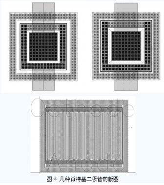 圖4 所示是在UMC 0.18um CMOS 工藝下設(shè)計(jì)的幾種肖特基二極管的版圖。它們的直流特性測(cè)試曲線如圖5 所示。從直流特性的測(cè)試結(jié)果