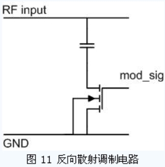 無(wú)源UHF RFID 標(biāo)簽一般采用反向散射的調(diào)制方法,即通過(guò)改變芯片輸入阻抗來(lái)改變芯片與天線間的反射系數(shù),從而達(dá)到調(diào)制的目的。一般設(shè)計(jì)天線阻抗與芯片輸入阻抗使其在未調(diào)制時(shí)接近功率匹配,而在調(diào)制時(shí),使其反射系數(shù)增加。常用的反向散射方法是在天線的兩個(gè)輸入端間并聯(lián)一個(gè)接有開(kāi)關(guān)的電容,如圖11 所示,調(diào)制信號(hào)通過(guò)控制開(kāi)關(guān)的開(kāi)啟,決定了電容是否接入芯片輸入端,從而改變了芯片的輸入阻抗。