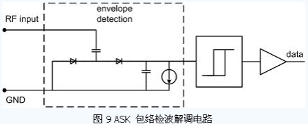 出于減小芯片面積和功耗的考慮,目前大部分無(wú)源RFID 標(biāo)簽均采用了ASK 調(diào)制。對(duì)于標(biāo)簽芯片的ASK 解調(diào)電路,常用的解調(diào)方式是包絡(luò)檢波的方式,如圖9 所示。