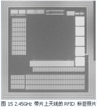 本文所介紹的一些RFID 標(biāo)簽的主要電路,大部分已經(jīng)經(jīng)過(guò)了流片的驗(yàn)證。圖14 是我們所設(shè)計(jì)的一款RFID 標(biāo)簽芯片。芯片面積0.7mm×1.0mm,在36dBm EIRP 下,可在6 米處讀出標(biāo)簽卡號(hào)。圖15 是2.45GHz 帶有片上天線設(shè)計(jì)的RFID 標(biāo)簽。在42dBm EIRP 下,該芯片可在40cm處產(chǎn)生響應(yīng)。