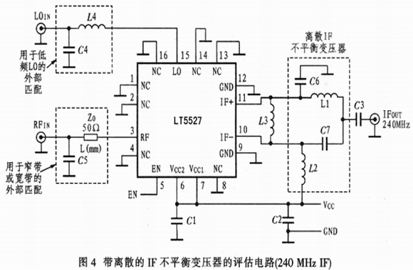 750 MHz以下的LO輸入匹配要求串聯(lián)電感L/4并聯(lián)電容C4,在650 MHz~830 MHz,其匹配網(wǎng)絡的L4=3.9 nH,C4=5.6 pF;在540 MHz~640MHz,其匹配網(wǎng)絡的L4=6.8 nH,C4=10 pF。評估板不包含L4的焊盤,因此可切斷近處的引腳15以便插入L4,L4是低功耗多層片式電感器。