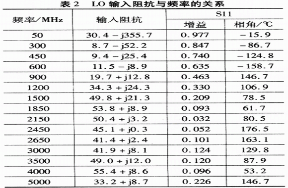 頻率大于1.2 GHz時,盡管放大器提供的功率有幾個dB,但最佳LD驅動功率只有-3 dBm(I/0輸入功率變化,混頻器性能不變);在頻率低于1.2GHz的情況下,盡管-3 dBm的L0驅動功率仍然提供高轉化增益和線性,但是為了得到最佳噪聲,LO驅動功率為0 dBm。自定義匹配網(wǎng)絡的阻抗數(shù)據(jù)見表2,并參考LO端沒有匹配時的情況。