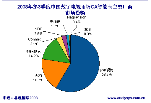 永新視博以58.7%的過半市場(chǎng)份額保持絕對(duì)領(lǐng)先,較上季度市場(chǎng)份額上升了15個(gè)百分點(diǎn),而天柏和數(shù)碼視訊分別發(fā)卡67萬(wàn)和51萬(wàn),都比上期有不少程度的下降。
