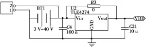 無線傳感器通常的工作電壓范圍為3.0V~3.6V。此次電源設(shè)計加入了TLFA274穩(wěn)壓器(如圖2所示),可轉(zhuǎn)換3V~40V的電壓,比如通常使用的小型電池或者是汽車電池,給使用者帶來了很大的方便。