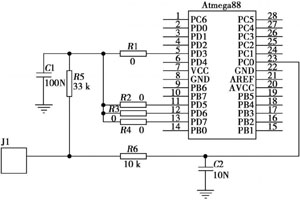 對微控制器芯片選擇Atmel ATmega88,因為它具有低功耗,還有待機模式和主動模式的快速轉(zhuǎn)換功能,所以無線傳感器能夠在非常短的時間完成數(shù)據(jù)的測量和傳輸;它有一個內(nèi)置的掉電檢測電路,可用來提醒用戶傳感器網(wǎng)絡(luò)電池是否需要更換;它還有一個內(nèi)置的A/D轉(zhuǎn)換器,可以將傳感器的模擬信號轉(zhuǎn)換成具有10位數(shù)字值的數(shù)字信號(零代表0V,210-1代表電源電壓和最大可能電壓)。