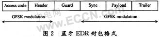 藍(lán)牙v2.0 EDR封包先在存取碼和標(biāo)頭的部分使用GFSK調(diào)變模式,但是,在保護(hù)時(shí)間5μs之后,負(fù)載部分則用π/4-DQPSK或8DPSK調(diào)變模式,如圖2所示。在保持指定的1 Ms/s符號(hào)速率前提下,增強(qiáng)速率分別提升資料速率到2 Mb/s或3 Mb/s,即每個(gè)符號(hào)發(fā)射二到三位碼元。通過(guò)測(cè)試發(fā)現(xiàn)結(jié)果,在封包的GFSK調(diào)變部分振幅顯得相當(dāng)固定,但在DPSK調(diào)變波形中振幅卻有較大的波動(dòng)。