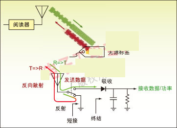 圖1:無源標(biāo)簽對射頻 RF能量進(jìn)行整流并調(diào)制信號,然后反向散射反射給閱讀器。