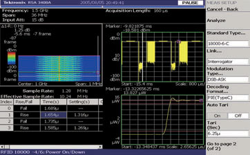 使用 RTSA 可以很容易地測量 TAT [參閱圖4]。首先,需要安裝一個頻率模板觸發(fā)器以獲取標(biāo)簽與閱讀器之間的整個查詢。RTSA 的功率與時間關(guān)系視圖使用戶能夠觀看整個發(fā)射過程。習(xí)慣認(rèn)為一個下行鏈路傳輸(由閱讀器到標(biāo)簽)結(jié)束到下一個下行鏈路傳輸開始之間的時間就是半雙工系統(tǒng)的 TAT。將一個標(biāo)記放在標(biāo)簽詢問的結(jié)束點(diǎn),第二個 δ 標(biāo)記置于反向散射的結(jié)束點(diǎn)或下一次閱讀器進(jìn)行數(shù)據(jù)發(fā)射的開始點(diǎn),就可以精確測量出 TAT 時間。在大范圍下行鏈路的條件下維持最短的 TAT 將有助于系統(tǒng)吞吐量的最大化。