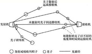 對天氣非常敏感是FSO的另一個主要問題。晴天對FSO傳輸質(zhì)量的影響最小,而雨、雪和霧的影響較大。據(jù)測試,F(xiàn)SO 受天氣影響的衰減經(jīng)驗值分別為:晴天,5~15dB/km;雨天,20~50dB/km;雪天,50-150dB/km;霧天,50~300dB/km。可見影響最大的是霧天,這是因為霧中的散射粒子的半徑與激光的波長在同一數(shù)量級上,而且散射粒子非常集中,從而使光線的傳播方向發(fā)生偏轉(zhuǎn),造成空間、角度和時間上的擴展,如圖2。對于這種大氣現(xiàn)象處理的方式,與微波通信中對待雨衰相似。要在系統(tǒng)傳輸?shù)挠嬎阒?,為光信號的衰減留有足夠的系統(tǒng)功率余量,以便在出現(xiàn)濃霧最大衰減的情況下,仍能接收到所需的光信號功率。重要的是,要獲得所在地長期的氣象統(tǒng)計資料,能夠知道不同等級(能見度)的霧,即不同衰減的大氣介質(zhì)出現(xiàn)的統(tǒng)計規(guī)律。如果了解到衰減值大于某一指標出現(xiàn)的概率,就能確定光無線系統(tǒng)為了保證可用性的指標(比如99.9%),需要容納多大的大氣損耗。而傳輸距離的計算公式如式(1)所示。