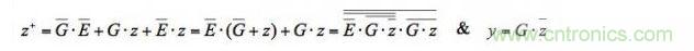 從這個(gè)公式可以看出,其中針對z+的最小項(xiàng)[E●z]不是多余的。它在最小項(xiàng)[G●E]和[G●z]之間扮演著反競爭橋的重要角色,可以消除G的所有邊沿處的連續(xù)競爭。