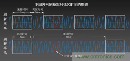 死區(qū)時間指的是示波器對采樣存儲回來的數(shù)字信號進行測量運算,顯示等處理的過程。其中死區(qū)時間內(nèi)示波器不進行采集。