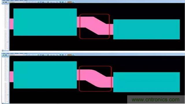 設(shè)計(jì)用于射頻和微波的銅皮形狀時(shí),一個(gè)很重要的方面是能夠創(chuàng)建帶尖拐角的Gerber 文件。優(yōu)秀的PCB設(shè)計(jì)工具可以簡(jiǎn)化這一過程。例如,使用50 毫米線條繪制形狀與使用50 毫米圓形光圈繪圖相比,往往令設(shè)計(jì)具有較小的半徑。設(shè)計(jì)工具在創(chuàng)建Gerber 文件時(shí),可通過正確地自動(dòng)轉(zhuǎn)換線條寬度來獲得尖拐角(圖2)。