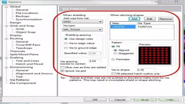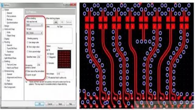 射頻設(shè)計(jì)的另一個(gè)重要方面是確保正確地屏蔽帶過孔的區(qū)域。盡管此任務(wù)可由設(shè)計(jì)人員手動(dòng)進(jìn)行,但這個(gè)過程極其耗時(shí)。如果PCB 設(shè)計(jì)工具能夠自動(dòng)完成此過程,將可以縮短設(shè)計(jì)周期時(shí)間并確保符合您的所有設(shè)計(jì)規(guī)則。利用此類工具,設(shè)計(jì)人員可以指定過孔模式生成規(guī)則,而將剩余的工作全部交由PCB 設(shè)計(jì)工具完成。