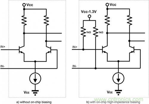 PECL 的輸入是一個(gè)具有高輸入阻抗的差分對(duì),該差分對(duì)的共模電壓需要偏置到VBB =VCC-1.3V,這樣允許的輸入信號(hào)電平動(dòng)態(tài)最大。對(duì)于不同芯片的輸入級(jí),信號(hào)允許的共模電平可能會(huì)有些差異,請(qǐng)參考相應(yīng)的datasheet。有部分芯片在內(nèi)部已經(jīng)集成了偏置電路,使用時(shí)直接連接即可,有的芯片沒有加,使用時(shí)需要在芯片外部加直流偏置。