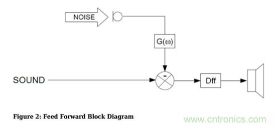 如果把系統(tǒng)畫成信號流圖,就是下圖,噪聲在麥克風(fēng)采樣后進入信號處理電路,產(chǎn)生“反”噪聲,并與音樂一起送進耳機內(nèi)。這種模式稱為前饋有源噪聲消除。