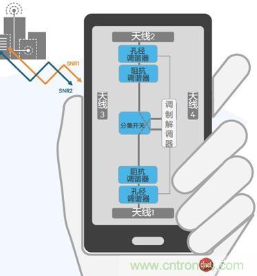 值得一提的是,高通的整合解決方案還支持載波聚合的TruSignal自適應(yīng)天線調(diào)諧技術(shù)。TruSignal可被看作是三項(xiàng)技術(shù)的總稱:第一是主分集天線切換,它是用來(lái)解決手機(jī)“死亡之握”的問(wèn)題——手機(jī)的主天線一般是在手機(jī)的下方,當(dāng)人們用手握住它的時(shí)候,信號(hào)會(huì)掉得非???,當(dāng)下方主天線被握死時(shí),它可以將天線切換到上面的分集天線去;第二是天線調(diào)諧——天線調(diào)諧技術(shù)又包含兩類,一類叫孔徑調(diào)諧,一類叫阻抗調(diào)諧,通過(guò)調(diào)諧天線的匹配,可以解決天線和PA之間的適配問(wèn)題;第三是高階分集接收——通過(guò)增加分集來(lái)提升接收性能,以及接收的下行速率。