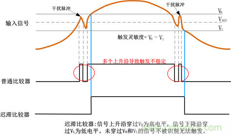 觸發(fā)電平只是一根參考電壓,而實(shí)際的波形在邊沿處是存在抖動(dòng)的,如圖8所示,圖中波形的干擾非常小,但是上升沿還是存在鋸齒狀,當(dāng)噪聲很大時(shí)抖動(dòng)會(huì)更劇烈。如果想穩(wěn)定觸發(fā)波形的上升沿,則需要在觸發(fā)電平的上下范圍內(nèi)使用遲滯比較,以過濾觸發(fā)電平附近的波形抖動(dòng)和毛刺。這個(gè)遲滯范圍就是觸發(fā)靈敏度。