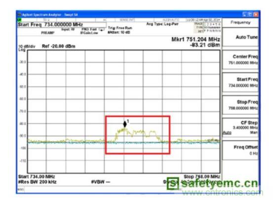 經(jīng)過查閱電源和芯片文檔得知其開關(guān)頻率的大約為1.9M,該頻率成分的電源噪聲會在調(diào)制過程中頻移到信號頻率兩側(cè)。然而由于使用較低靈敏度的探頭智能確定處板上下半部分都是可能的輻射雜散信號源,卻無法定位精確的位置。此時我們需要進(jìn)一步使用套件中精度更高的磁場環(huán)形探頭或者垂直向磁場探頭來確定最強(qiáng)區(qū)域。最終發(fā)現(xiàn)在750MHz+/-17MHz在紅色框標(biāo)示區(qū)域最強(qiáng)。測試結(jié)果請參考圖7所示,此處750MHz附近的近場輻射為-83.21dBm,2.25GHz處最大近場輻射為-44.18dBm。