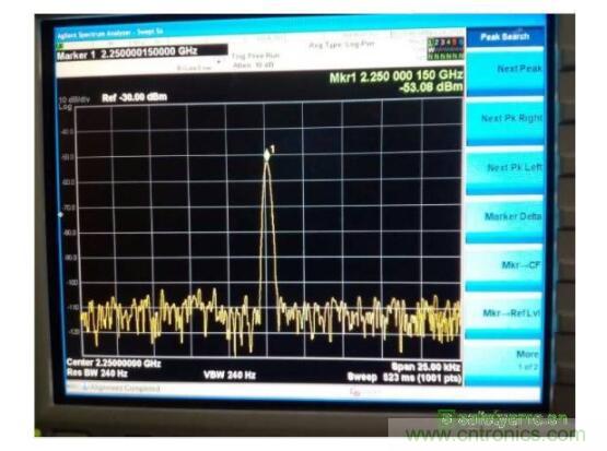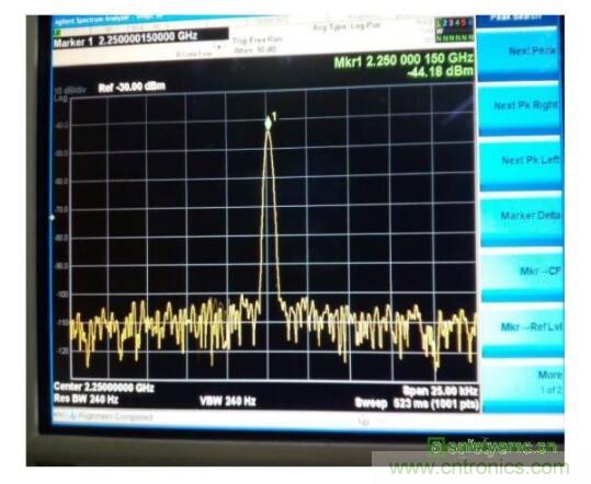 開關(guān)是正常工作的,由于天線開關(guān)本身是非線性器件,因此首先確認(rèn)天線開關(guān)的影響。將天線開關(guān)旁路(天線仍然正常)如圖5所示,發(fā)現(xiàn)此時2.55GHz的雜訊可以降低到-55.7dBm左右,因此可以確定天線區(qū)域的雜訊就是調(diào)諧開關(guān)造成的。