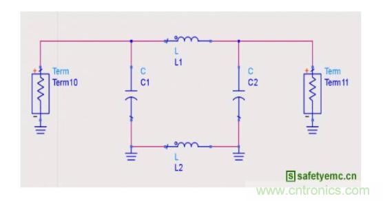 由于2.25GH大約是750MHz的三次諧波,因此我們首先針對750MHz做濾波設(shè)計。為了克服這種干擾應(yīng)該對基帶信號加以濾波,阻止高頻成分傳播和搬移。如圖8所示是一種推薦電路,其中電容C1、C2和L2可作為備選,將此電路加在圖6黃色框圖標(biāo)示的電源入射端口附近做濾波。