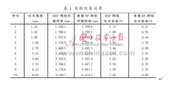 仿真實(shí)驗(yàn)結(jié)果表明:利用RBF神經(jīng)網(wǎng)絡(luò)融合能比較精確地檢測(cè)到信號(hào)缺陷深度,在學(xué)習(xí)能力和檢測(cè)精度上,RBF神經(jīng)網(wǎng)絡(luò)均優(yōu)于常規(guī)BP神經(jīng)網(wǎng)絡(luò),該方法的平均絕對(duì)誤差一般為2.69%,而常規(guī)BP神經(jīng)網(wǎng)絡(luò)的平均絕對(duì)誤差為5.47%。可見,前者檢測(cè)效果明顯好于后者。