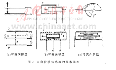 電容位移傳感器的三種基本類型如圖2所示。其具體結(jié)構(gòu)可視實(shí)際運(yùn)用的場合靈活多變,電容極板可以是平面的或者球面的;運(yùn)動電極可以采用水銀等導(dǎo)電液體。圖2所示的三種基本類型均可組成差動式結(jié)構(gòu),如各分類中下部圖形所示。采用差動式結(jié)構(gòu)能夠提高傳感器線路的輸出靈敏度,減小非線性,還能在一定程度上抑制由靜電吸引帶來的誤差。當(dāng)要求測量系統(tǒng)具有很高的分辨力時(shí),一般是保持極板面積相對固定而使電容傳感器極板間隙隨被測位移改變,即如圖2(a)所示的結(jié)構(gòu)。反之,采用保持間隙恒定而讓極板相對面積可變的結(jié)構(gòu),則可以在相當(dāng)大的動態(tài)范圍內(nèi)獲得線性的響應(yīng)[1]。
