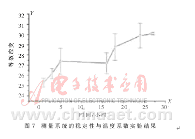 擬合方程顯示在圖中上部的方框里。從實(shí)驗(yàn)結(jié)果可看出,一微米位移可獲得變壓器電橋讀數(shù),變化為127.02,輸出特性的非線性誤差小于0.15%F.S.。比率臂第五檔變化一個數(shù)對應(yīng)的位移量根據(jù)傳感器結(jié)構(gòu)的不同,一般在5~8納米之間,末級的數(shù)據(jù)采集器可獲得300多毫伏的輸出,從數(shù)據(jù)采集器便能夠分辨出0.02納米的變化。在實(shí)驗(yàn)室環(huán)境下,傳感器測值隨著溫度的變化會產(chǎn)生極大的漂移,用標(biāo)準(zhǔn)元件來檢查變壓器電橋測量系統(tǒng)的溫度系數(shù)與穩(wěn)定性,所得結(jié)果見圖7。在28小時(shí)的實(shí)驗(yàn)期間測值等效變化僅為0.1納米,環(huán)境溫度變化為3~4℃。作者還曾將差動電容式位移傳感器放到100米深的鉆井底部,那里溫度的年變化不到0.03℃,整個位移測量系統(tǒng)月漂 移率僅為0.1納米[3]。