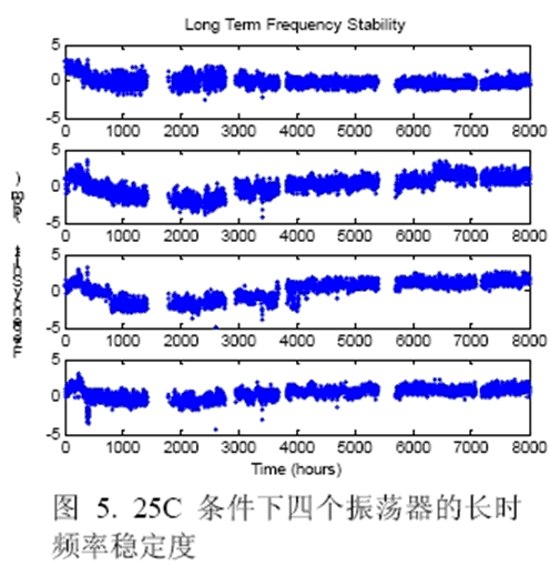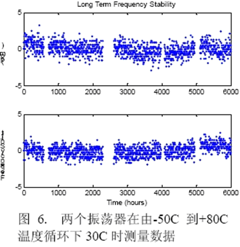 圖6顯示了在進行溫度循環(huán)試驗時兩個振蕩器的頻率穩(wěn)定度。數(shù)據(jù)在-50℃到+80℃正溫度循環(huán)和負溫度循環(huán)中的30℃情況下獲得,數(shù)據(jù)采集自600個溫度循環(huán),以3ppm為規(guī)范容許范圍則沒有頻率漂移。