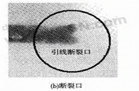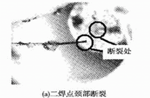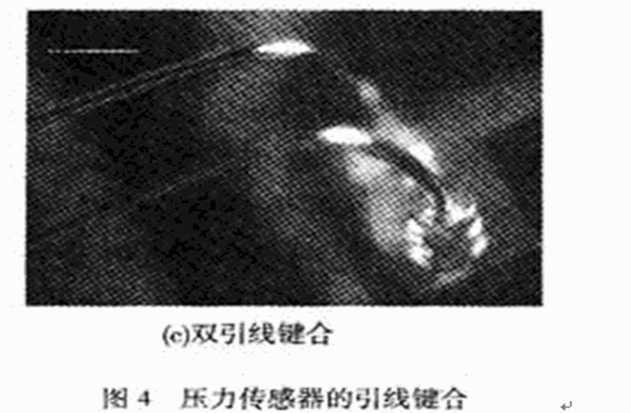 用于引線鍵合的鍵合線有Al線和Au線,由于Au線性能更優(yōu),所以壓力傳感器的鍵合工藝選用Au線。鍵合時要使鍵合面保持清沽,否則會影響鍵合強(qiáng)度,等離子清洗是一種能有效提高鍵合強(qiáng)度的方法。由于機(jī)油壓力傳感器工作環(huán)境惡劣,尤其是頻繁的振動會導(dǎo)致金絲有缺陷的地方疲勞斷裂,或者最容易疲勞的位置如第二焊點附近的頸部位置發(fā)生斷裂,因此要求更高的鍵合質(zhì)量。曾對所研制的機(jī)油壓力傳感器進(jìn)行了臺架試驗,在一批試驗樣品中經(jīng)過6×105次加壓和卸壓試驗之后,發(fā)現(xiàn)有兩個樣品失效,故障分析結(jié)果表明:一個樣品的失效模式為信號處理電路上的一個電阻損壞;另一個樣品的失效模式為金絲線斷裂,如圖4(a),(b)所示。對于這種情況,可以采用雙金絲鍵合工藝,并盡量選用高純度、低缺陷的金絲,并做好引線鍵合前各封裝器件的清潔工作,如圖4(c)所示。這樣對金絲鍵合工藝進(jìn)行改進(jìn)后,在可靠性試驗中,未曾出現(xiàn)金絲斷裂的質(zhì)量問題。