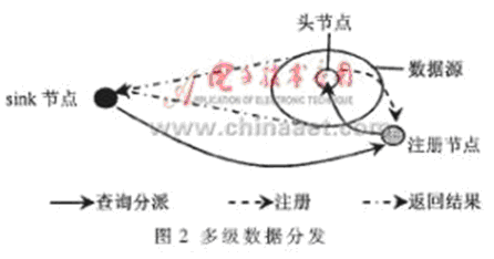 (5)多級(jí)數(shù)據(jù)分發(fā)方案(multi-resolution data dissemination scheme)[4],綜合了LS和DCS數(shù)據(jù)分發(fā)方案的技術(shù)。其基本思想是在數(shù)據(jù)源中選擇一個(gè)頭節(jié)點(diǎn),代表源節(jié)點(diǎn)在最近的注冊(cè)節(jié)點(diǎn)上進(jìn)行注冊(cè)。sink節(jié)點(diǎn)把查詢發(fā)送到所有注冊(cè)節(jié)點(diǎn)上,從注冊(cè)節(jié)點(diǎn)再把查詢發(fā)送到所有匹配的頭節(jié)點(diǎn),當(dāng)頭節(jié)點(diǎn)收到查詢后,在數(shù)據(jù)源內(nèi)選擇一組節(jié)點(diǎn)進(jìn)行查詢。由于sink節(jié)點(diǎn)的位置包含在它分派的查詢中,查詢節(jié)點(diǎn)可以直接把感知數(shù)據(jù)發(fā)送給sink節(jié)點(diǎn),其基本思想如圖2所示。這種數(shù)據(jù)分發(fā)方案避免了查詢泛洪,能有效減少能量消耗。但是在數(shù)據(jù)源中只是基于感知范圍參數(shù)來(lái)選擇查詢節(jié)點(diǎn),沒(méi)有考慮數(shù)據(jù)的分布情況。