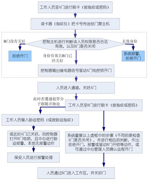 當(dāng)任一門開(kāi)啟超過(guò)規(guī)定時(shí)間后未關(guān)閉或假鎖,則通過(guò)現(xiàn)場(chǎng)蜂鳴或管理主機(jī)報(bào)警提示關(guān)門。