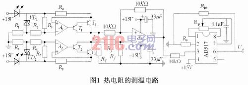 熱電阻的測溫電路如圖1所示,該電路由毫安級恒流源產(chǎn)生電路、差分運算電路和AD517芯片組成。該電路采用兩個完全相同的毫安級恒流源分別給熱電阻RT和標(biāo)準(zhǔn)參考電阻Rf供電。在恒流源電路中,VD1和VD2為帶溫度補(bǔ)償?shù)姆€(wěn)壓二極管,四個PNP型的三極管T1、T2、T3和T4組成了兩個PNP型復(fù)合管,其目的是為了提高放大器的增益,減小誤差,以便提高恒流源的穩(wěn)定度。恒流源與RT和Rf(Rf取為Rf=100Ω)與地組成的電路產(chǎn)生的電壓作為差分運算電路的輸入信號,根據(jù)電路的組成,可以得到差分運算電路的輸出電壓是與熱電阻的阻值成正比的,通過選擇合適的元器件參數(shù)把該裝置的測溫范圍設(shè)置為0~120℃。